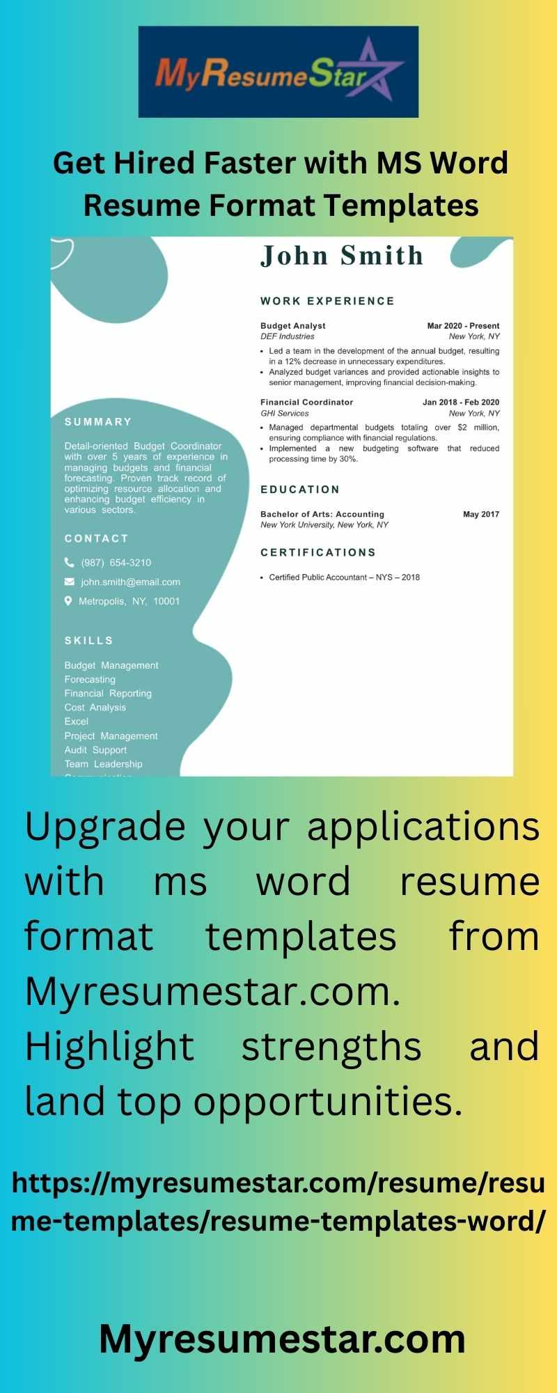 Upgrade your applications with ms word resume format templates from Myresumestar.com. Highlight strengths and land top opportunities.